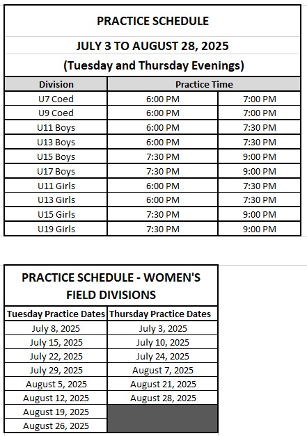 Practices begin on July 3, 2025 and run on Tuesday and Thursday evenings.